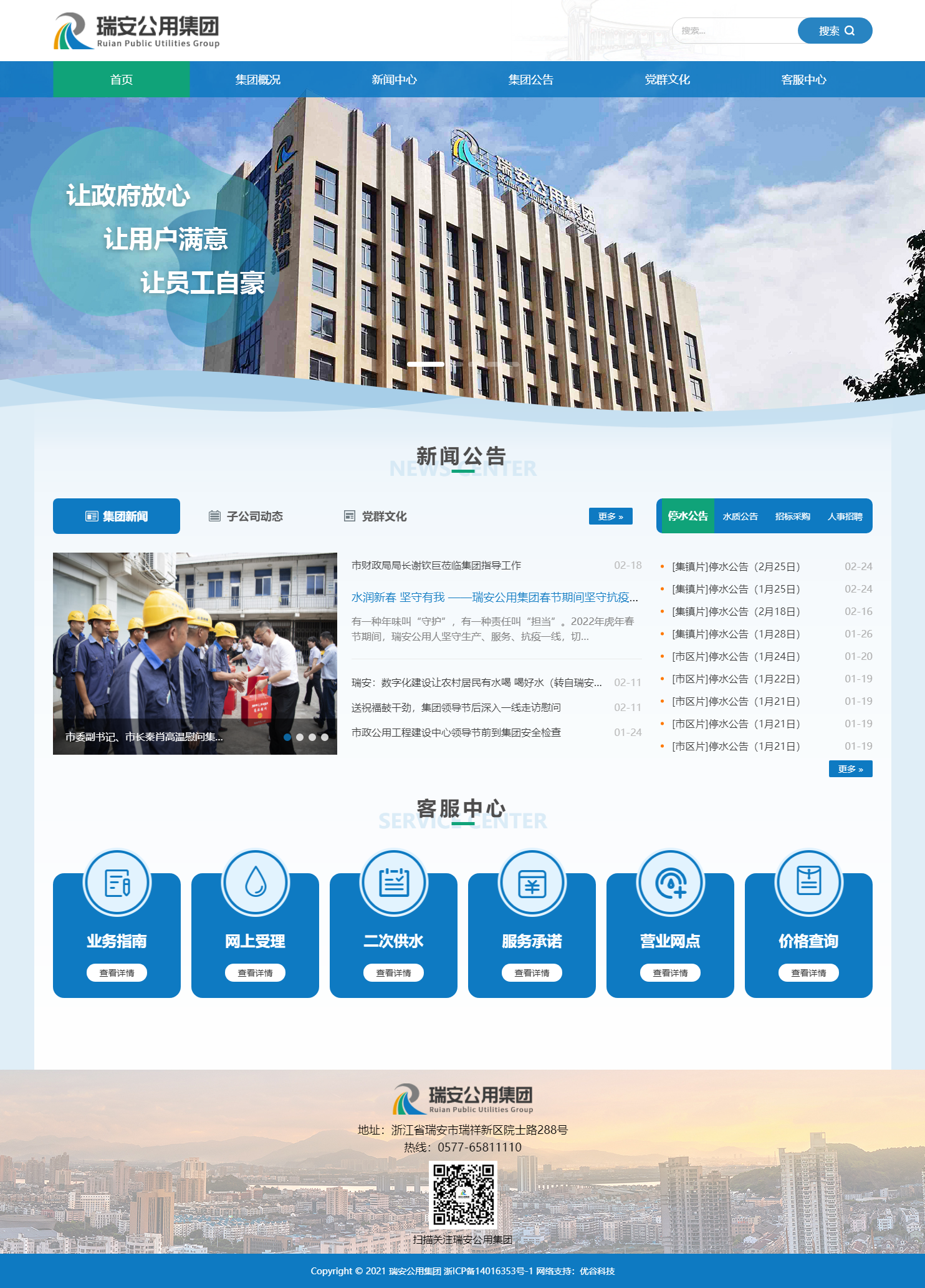 瑞安市公用事業(yè)投資集團(tuán)有限公司秉承“讓政府放心、讓用戶滿意、讓員工自豪”的企業(yè)宗旨,以保障社會民生為中心任務(wù),推進(jìn)城市給排水一體化運(yùn)作,規(guī)范天然氣供氣市場,有效整合我市水務(wù)、燃?xì)?、污水收集與處理、排水設(shè)施建設(shè)運(yùn)營等公用事業(yè)資產(chǎn),有效提高公用事業(yè)資源集成效率和資本運(yùn)作能力,推進(jìn)各項(xiàng)公用事業(yè)基礎(chǔ)設(shè)施的投融資和建設(shè)任務(wù),著力建設(shè)“供水網(wǎng)、排水網(wǎng)、供氣網(wǎng)”三張網(wǎng),打造集投資、建設(shè)、運(yùn)營于一體的公用建設(shè)管理體系,為打造品質(zhì)之城、建設(shè)幸福瑞安作出更大貢獻(xiàn)。